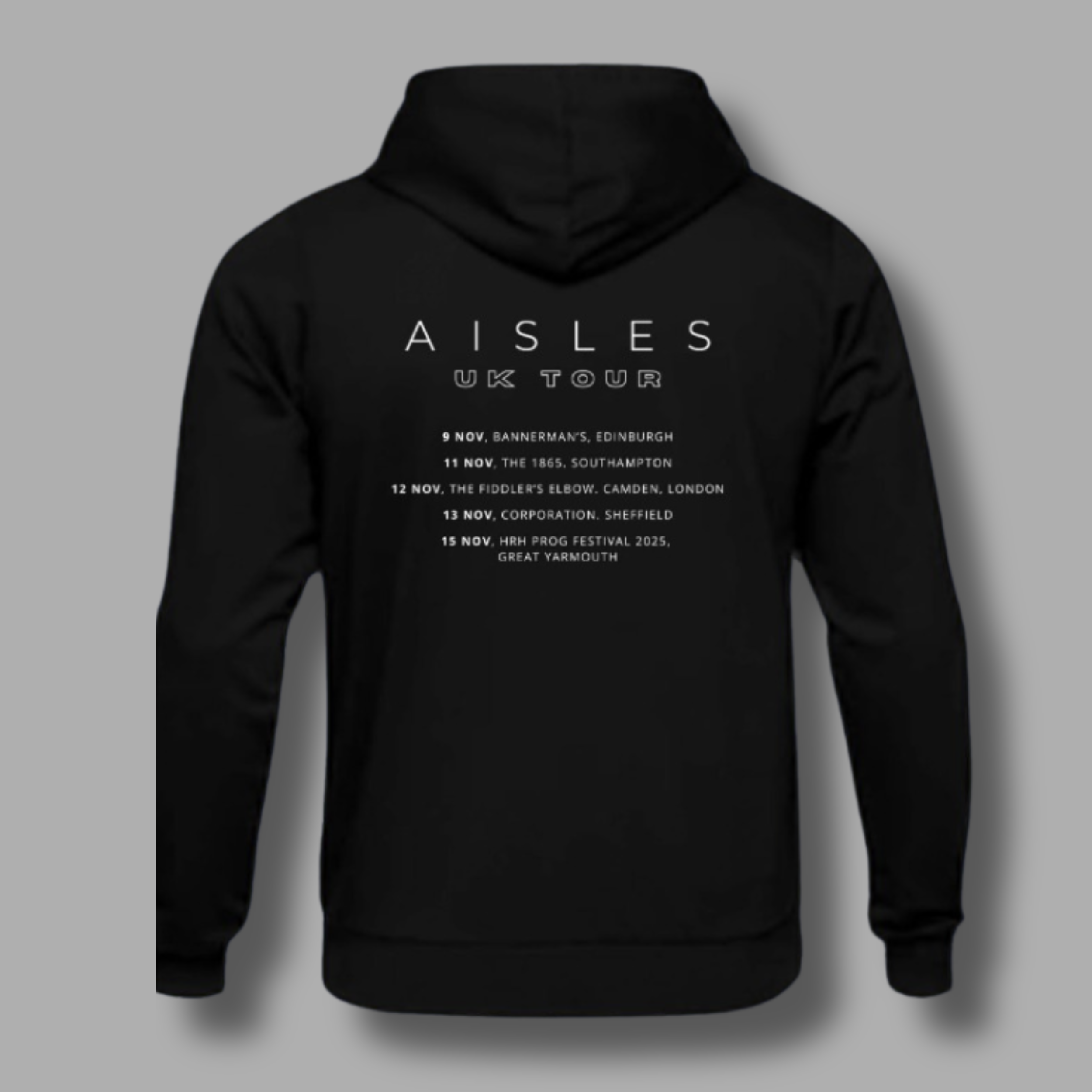 Este polerón hoodie de Aisles fue diseñado exclusivamente para la gira UK 2025 y ahora está disponible en una edición muy limitada para fans que no pudieron estar en los conciertos, o que quieren llevarse un recuerdo especial de esta etapa de la banda.